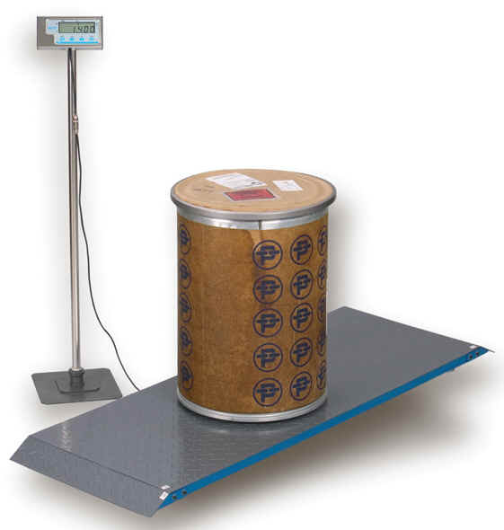 DS1000 Drum Scale *55.75" long x 20.25" wide x 2.5" high *1000 lb x 0.5 lb *Scale platform is made of painted steel *Digital weight indicator has a stainless steel housing with a black plastic wall mounting bracket *Scale weight is 60 lb, shipping weight is 68 lb *Operates on (4) AAA batteries & AC adapter included. 20 hour continuous use battery life *Front panel keys are: Hold/Print, LB/KG, TARE, ON/OFF/ZERO *RS232 computer/printer output *Optional 36" high post for weight display: $45